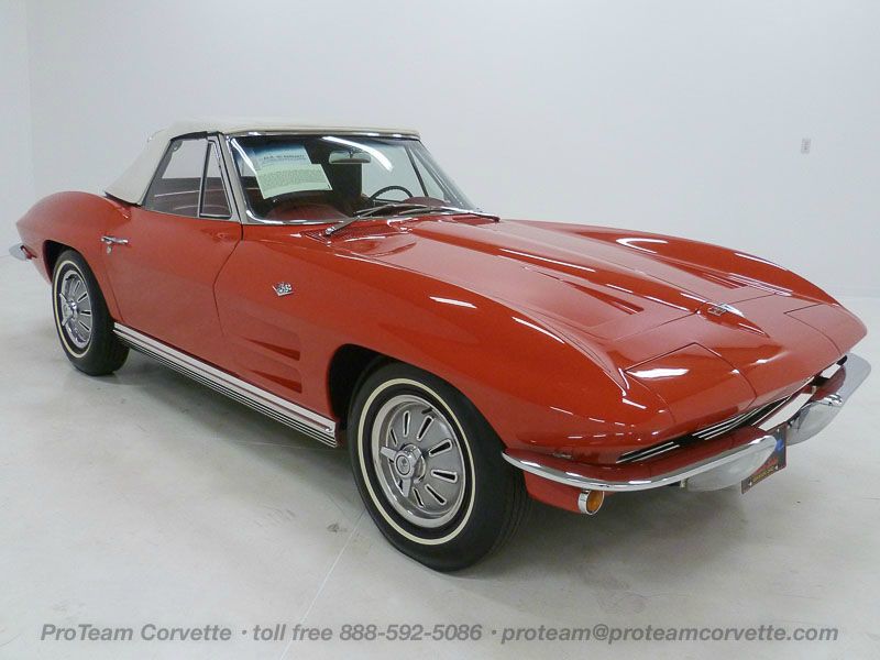 1015R..1964 Corvette Convertible, 327-365 hp, 4 speed, numbers matching original motor, transmission and rear end, Also has factory original body/trim tag. Riverside Red paint with matching Red interior and White soft top. NO HIT original front end with rust free chassis. Ground-up restoration with show quality paint, interior, top, chrome, glass and trim. Rebuilt suspension, brakes, motor, with new exhaust and new weather stripping. Highly desirable 365 hp solid lifter motor with 11 to 1 compression which is the same as the L84 fuel injection. Also has an affirmation by CCAS/Grenning as to the legitimacy and originality of the engine block, stamp pad, and the engine stamp. Optioned with M-20, posi, AM/FM radio, aluminized off road exhaust, seat belts, tinted windshield, hubcaps, and 7.75x15" white stripe tires. Most all factory correct type components including the spare, jack, jack tools, washer system, shifter, shielding, air cleaner, distributor, idler pulley, spark plug shields, hoses, hose clamps, valve covers, fuel filter, #2818 carb, finned balancer, 6-quart oil pan, gas door assembly, glove box door, owners manual, and sales brochure. Documented with CCAS/Grenning Engine Stamp Affirmation, 3-ring binder and large show board. Production date of October 31st, 1962 and delivered new by Tropical Chevrolet in Miami, FL. (dealer code 508 in zone 26) per the official NCRS/GM Shipping Data Report (SDR). Looks, runs, and drives excellent. CC:1 $129,000.00