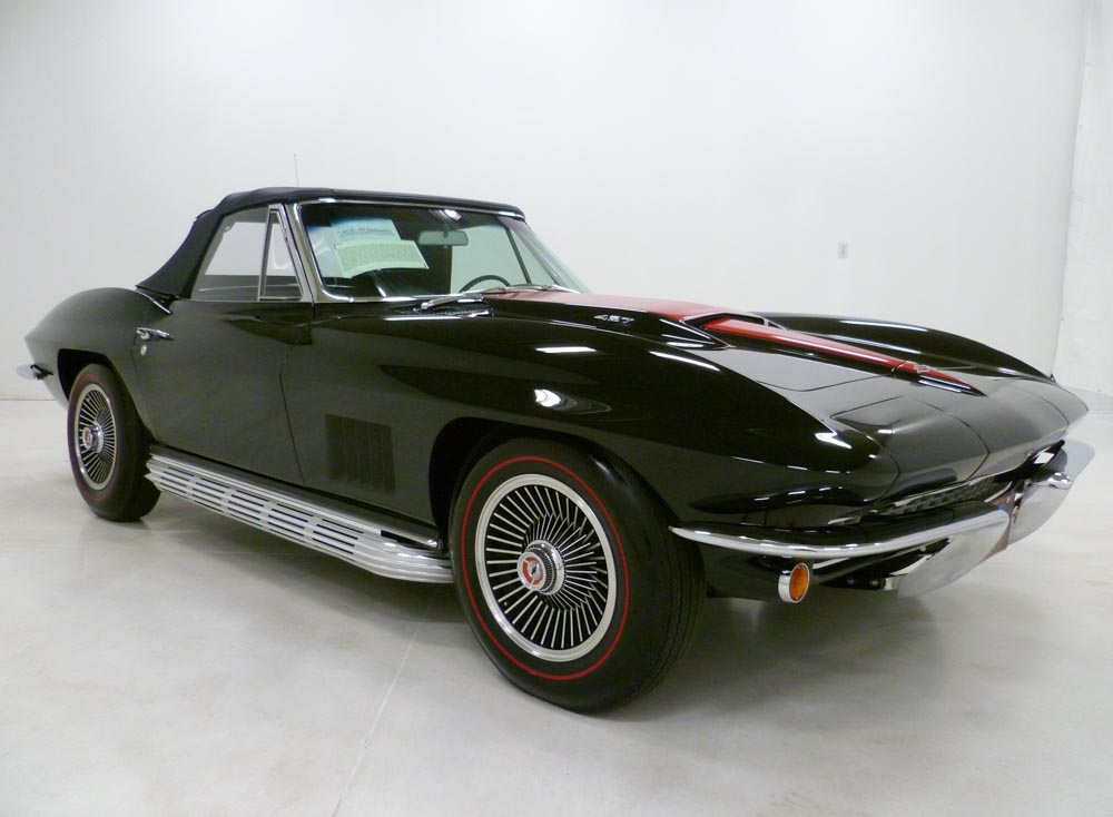 1008W..1967 Corvette Convertible, 427-390 hp, 4 speed, numbers matching original motor with CCAS/Grenning Affirmation and also has factory original body/trim tag. Tuxedo Black paint with Red stinger, Black interior and Black soft top. Comprehensive restoration that appears body-off in show condition for Bloomington Gold and NCRS type judging. Optioned with factory side exhaust, leather, M-21, posi, SS brakes, AM/FM radio, B.O. aluminum wheels and vintage Firestone 7.75x15" red stripe tires. Most all factory correct type components including the spare, jack handle, clear floor mats, shocks, seat belts, washer system, tar top battery, shifter, shielding, braided wires, air cleaner, alternator, #3811 carb, hoses, hose clamps, radiator, gas door assembly, Bowtie mirror, glove box door, owners manual and sales brochure. Documented with the CCAS/Grenning Engine Stamp Affirmation, owner history, two show boards and the NCRS Shipping Data Report with production date of September 6th, 1966 and delivered new by Van Chevrolet in Shawnee Mission, KS (dealer code 885 in zone 5) per the official NCRS/GM Shipping Data Records (SDR). This recently restored Corvette has yet to be shown, creating an exciting opportunity for the next owner to exhibit the car and compete for trophies, awards, and recognition! Looks, runs, and drives excellent. CC+2 Corvette consigned to Mecum Indy Classic Car Auction | May 8th – 16th, 2026
