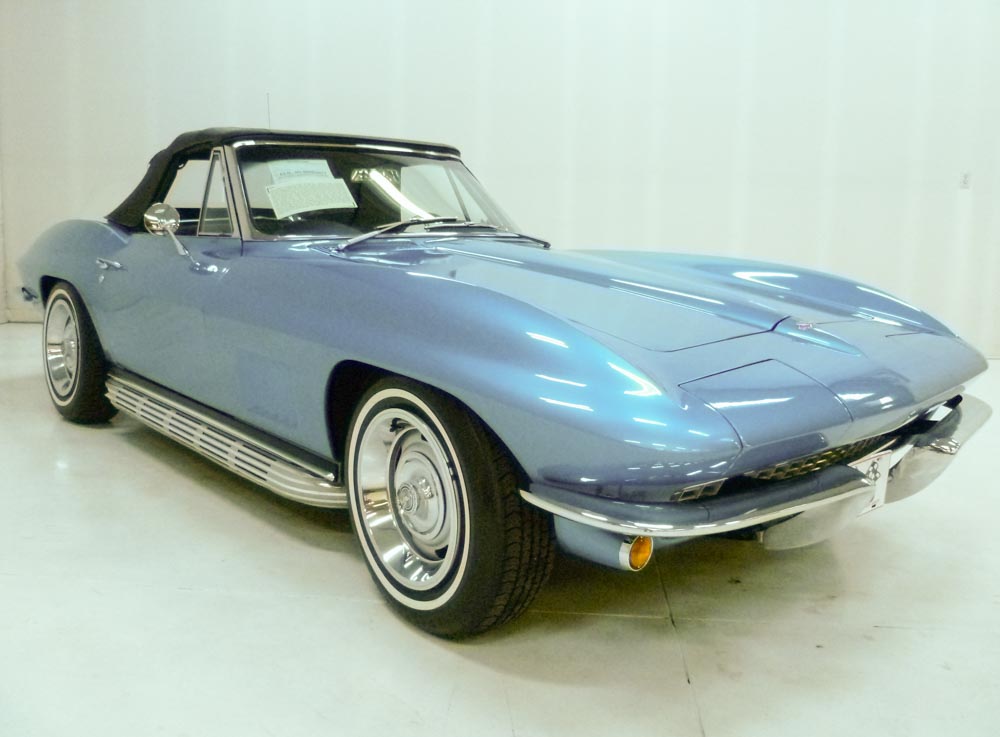 1042Q..1967 Corvette Convertible with two tops, 327-350 hp, 4 speed, numbers matching original motor with CCAS/Grenning Engine Stamp Affirmation, also has factory original body/trim tag, 42,071 actual miles. Lyndale Blue paint with Black interior and White soft top. Original unrestored low-mile car in excellent condition. Bloomington Benchmark, Bloomington Gold certified, Bloomington Gold Survivor, multiple NCRS Top Flights, Bloomington Special Collection 3-times, Gold Concours award and Triple Crown award. Known as the Five Dollar Special! These original unmolested cars are among the rarest of rare and are rising to the top of the Corvette food chain as unrestored cars are used as guideposts for restorers, shining a light on the way vehicles were originally built. The solid feel of an excellent unrestored car cannot be overstated! This car is one of the elite few recipients of America’s most prestigious Corvette awards, the happy result of a lifetime of diligent care and discerning use. Unrestored and original!! It was judged worthy of Bloomington Gold Certification, Survivor and Benchmark honors, the latter being the most important of all to the demanding collector. Benchmark Certification recognizes each recipient as not only unrestored—a quality recognized in Survivor judging—but also that it remains in showroom condition, exactly as it was upon delivery from the factory with the exception of aging. These qualities make it the perfect source of reference for a top-quality restoration of a like car, ergo the term “Benchmark.” Benchmark Certification is only awarded to cars that have achieved both Gold and Survivor on the same weekend, qualify in all four Survivor categories. Benchmark is, by definition, the most important distinction in the entire Corvette judging regime, one awarded to fewer than 230 Corvettes 1953 to 1972 and less than 70 were 1967s as of this writing—including this jewel. The expenses involved in obtaining these awards could surely exceed $20,000.00. The engine, transmission and rear end are original to this car. Optioned with factory side exhaust (which was added and we have the original undercar exhaust and the rear valance), telescopic, auxiliary hardtop, M-21, 3.70 posi, SS brakes, AM/FM radio tinted windshield, rallys, redline tires, and custom fit car cover. Most all factory correct type including the spare, jack, jack tools, clear floor mats, Delco shocks, seat belts, washer system, shifter, shielding, air cleaner, alternator, distributor, spark plug shields, hoses, hose clamps, carb, window glass, valve covers, starter, ball joints, expansion tank, radiator, gas door assembly, bowtie mirror, glove box door, warranty book, owners manual, sales brochure, and T-3 headlights. Documented with the dealer invoice, tank sticker, warranty book/P.O.P., owner history, show history, old titles, photo album, certificates/awards, judging sheets, ribbons, and no less than five 3-ring binders. Also has an affirmation by CCAS/Grenning as to the legitimacy and originality of the engine block, stamp pad, and the engine stamp. Editorialized multiple times as the Five Dollar Special!! Looks, runs, and drives excellent as the optional 350 hp engine proved to be one of the most civilized engines produced in 1965 to 1967. $149,000.00